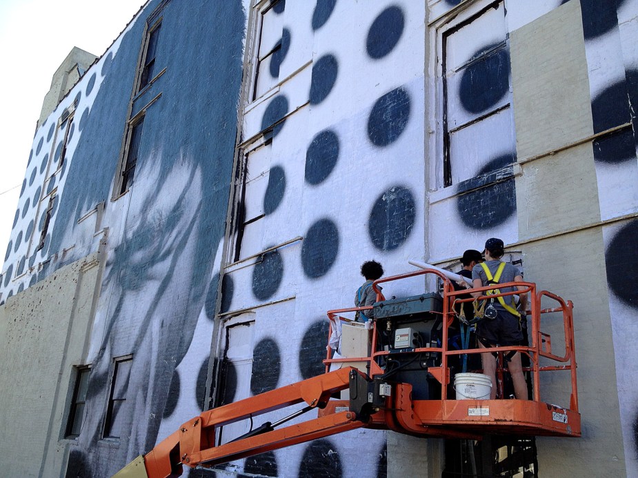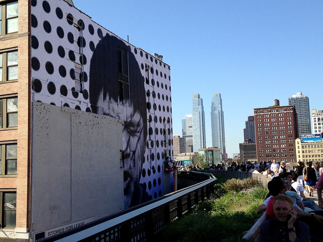 Was at the highline today (towards 30th St entrance), and was surprised to see JR, a French street artist (and 2011 TED prize winner) working on his latest project.