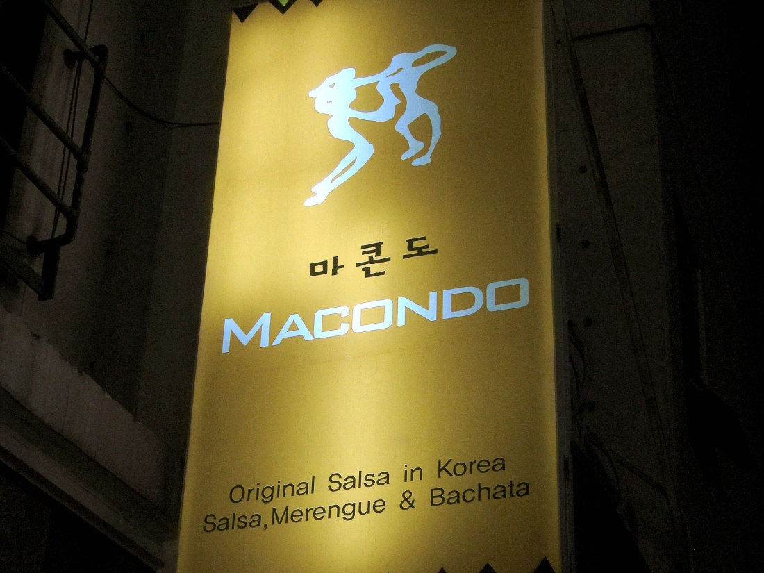 So the following week, I hit up Macondo (Donggyo-Dong 169-21, Hongdae near Hongik University subway station). Much smaller club (probably about 1/3 the size of Club Turn), but much more intimate feeling, and it looked as though people were enjoying themselves more than at Turn. I think that’s also somewhat of a complaint I have with the salsa scene in general. There were probably ‘better’ dancers at Turn, but much like in the NY scene, a lot of people place so much focus on being technically proficient and looking good out on the floor, that they frequently forget how to just have some fun while social dancing. Another good thing about Macondo was the Dj’s rotation. Approximately 3-4 salsa, then 2 bachata, and 1-2 merengue. Definitely more my cup of tea. All in all, I was really impressed by the Latin scene present in Korea, and though they may not have the same sabor that I see in NY dancers, they definitely have just as much passion!
